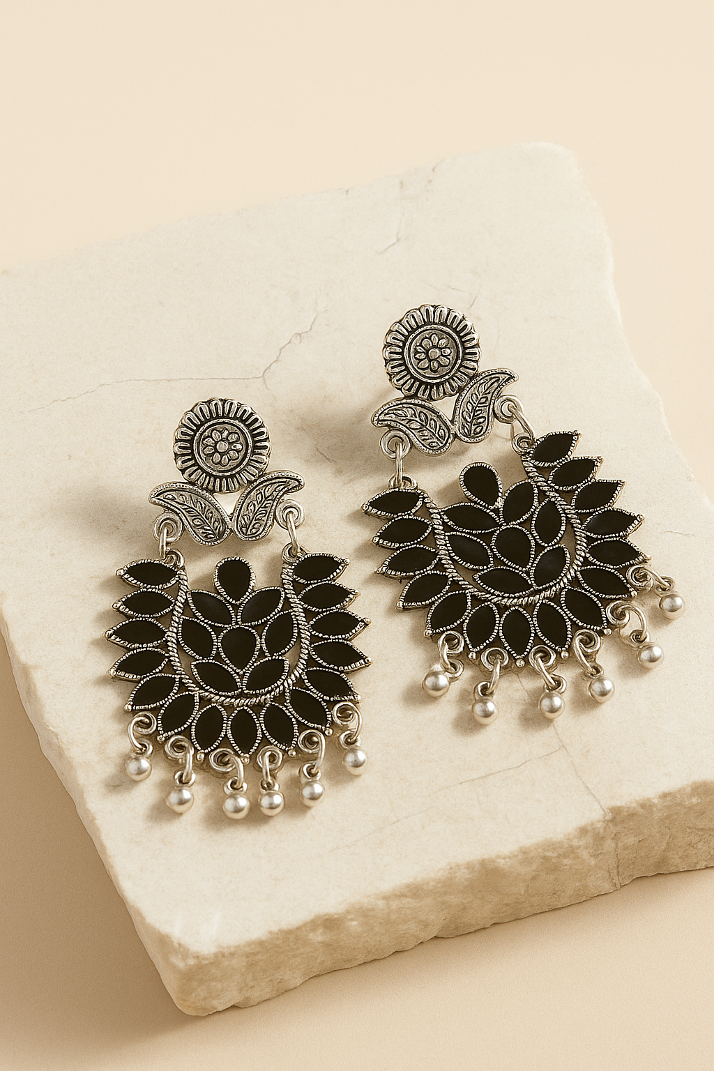 Elegant oxidized silver drop earrings with black leaf design, floral stud top, and dangling beads — a perfect blend of traditional and modern charm.